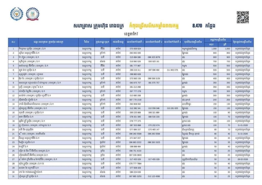 ខេត្តតាកែវ មានឱកាសការងារ ជូនបងប្អូនប្រជាពលរដ្ឋ ជាពិសេសអតីតពលករដែលវិលត្រឡប់មកប្រទេសកម្ពុជាវិញ ចំនួន៨៤៧០កន្លែង